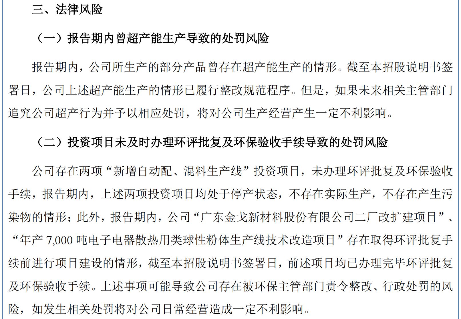 根据招股书,报告期内(2022年—2024年),金戈新材所生产的部分产品曾存在超产能生产的情形,虽已履行整改规范程序,但仍存在相关处罚风险。