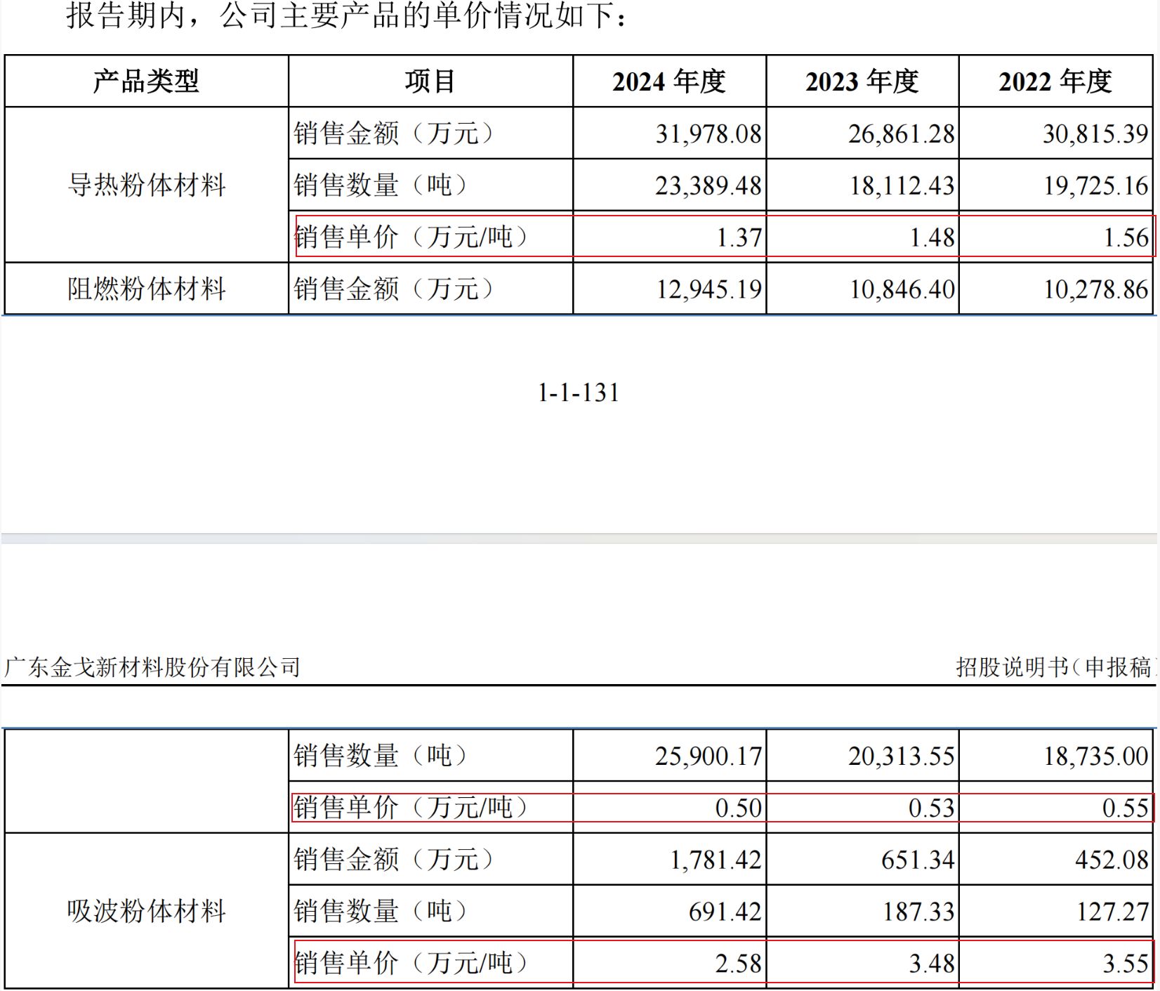 在此市场背景下,金戈新材选择“以价换量”。公司主要产品为导热粉体材料和阻燃粉体材料,报告期内二者贡献收入占公司主营收入比例均超过95%。然而报告期内,公司两类核心产品均价持续走低:导热粉体由1.56万元/吨降至1.37万元/吨,阻燃粉体由0.55万元/吨降至0.50万元/吨。