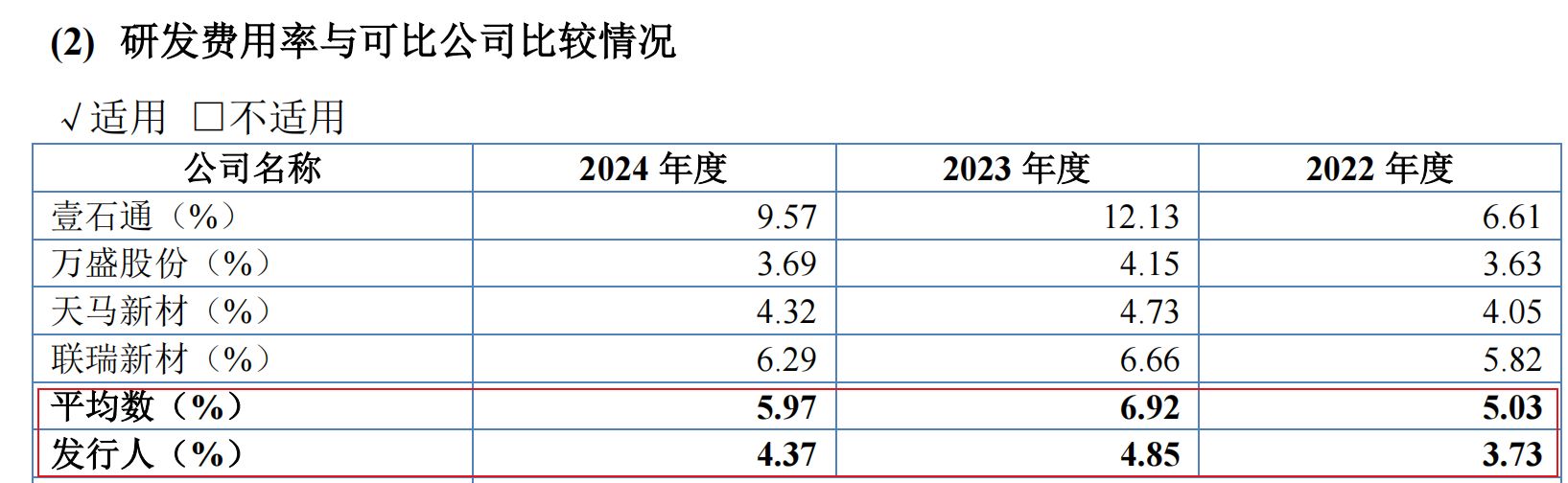相比之下,金戈新材的研发投入却显得“吝啬”。报告期内,公司研发费用率分别为3.73%、4.85%和4.37%,连续三年低于可比公司的平均水平(5.03%、6.92%、5.97%)。