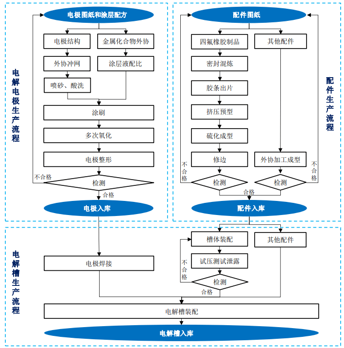 本项目产品的生产工艺流程主要分为电解槽及其关键部件的生产流程,公司的主要产品为电解电极、电解槽及配件,具体的生产流程如下: